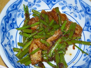 残りはさっと茹でて4センチぐらいに切り、揚げをいれてゴマ油でいため