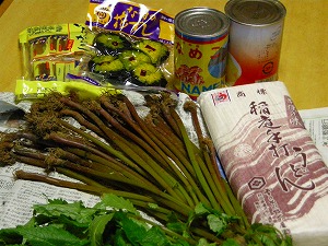 宅急便の内容、稲庭うどん3キロ、漬物2種類、なめこの缶詰一個