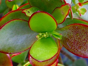 そんな「お金のなる木」水遣りで何気に横をのぞいたら小さなピンクの蕾が付いてる