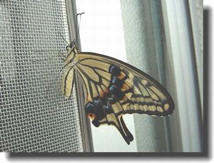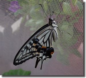 今日この頃、 今日はナミアゲハのサナギが孵化し、きれいなナミアゲハになったぞ 公休日、朝起きて、何して過ごそうか・・・ ぼんやりテレビを眺めながら朝食、 さてと、っとサナギの様子を伺いに窓際のハカラメの鉢を覗いて 仰天、 一番乗りのサナギがもぬけの殻だ。 まだ早いのに・・・と回りを見渡すと舞っていました、部屋の中 元気が良い、かなり早朝に孵化したのだろうとさっする。 デジカメ取り出してとにかく撮る。 美しい、いつまでも眺めていたいが そうも行くまい。 すぐに逃がしてやる。 予定より一日早い孵化だ。 そう言えば、キンカンの葉で育った幼虫たちは ユズの葉で育ったのより成長が早いのだ。 キンカンには一番最後に卵を産みつけてあって タマゴで見つけたのはキンカンだけなのだ。 それなのにすでに幼虫になっているゆず先住幼虫よりも どんどん追い越してゆく成長振りだった。 食べる葉によるのだろうか。 さてユズで育った幼虫達の内の一号はサナギになってから 10日になる、標準から言ったら孵化する頃。 見てきたがまだのようだ 首の辺りに切れ込みが見えてきたので もうじきなのだろうけど ベランダの鳩よけネットにサナギになっているので、 いつの間にか孵化して飛んでいってしまうかもしれないな。 これもやむを得ないのだけどね。
