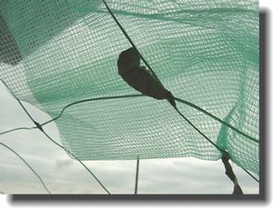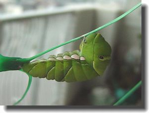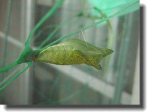 案の定ユズの木にいた一番大きなイモムシ3匹がいなくなった。 ベランダ中探したが見つからない。 やっぱり夜中にユズの木から下りてしまった。 上手い具合にサナギになる木を探してくれたらいいのだけど どうして近くの鉢に移らないのだろう悔しくてたまらない。 見つからないと知りつつも 探しまくってひょいっと上を見上げたら 鳩よけのネットに1匹しがみついていた。 こんな所に、 鳥達によく見えるところだ、 食べられてしまう事間違いなし、 糸でぶら下がっているので もう移動してあげる事もできない 昨年の経験から言うとまだ一日ぐらいこのままの格好で ぶら下がっているはず、 サナギになるまでの間何とかしないと・・ 良い物があった、 生ゴミ用のネットを上に張り巡らせてみた。