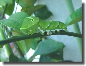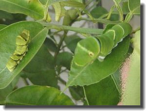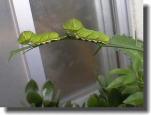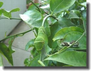 ユズ4号もイモムシになる(左) 大きさがかなり違うイモムシの同居。 実際の所、ユズ1号、二号、三号は見分けが付かなくなった。 どれがどれか・・・行動パターンが読めないのだ。 さて、全く違うキンカンの木に産み付けられたタマゴ4個が 孵化して、順調に成長してる。 のはいいのだけどキンカンの木が小さいので 4匹の餌として間に合うのだろうかと一抹の不安がよぎる。 現在でも一枝が全くの坊主になってしまった。 本人達も行き場が無くなって戸惑ってる様子。 でもそのうち葉の沢山ある場所に移動するだろう・・