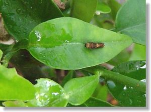 ナミアゲハの幼虫、ユズの木に5匹、 3匹はかなり大きくなった。 もうそろそろユズの木から下りてサナギになる為の木を 探しにウロウロしだす頃。 ユズの木は大きいので 移動する事ができない、 夜徘徊されたら行方不明になる事間違いなしだ。 昼私がいるときに徘徊してね。 産卵の時期がかなり遅いユズ4号 まだ鳥のフン状態の擬態だ、(右側) そろそろイモムシになる頃。