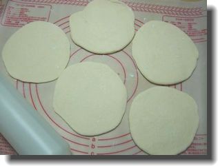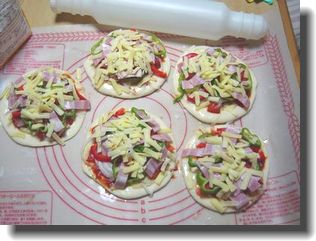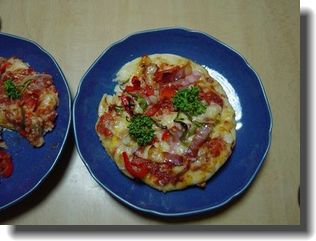 強力粉を買ってきた、 ネッ友のTサンが作ったピザが美味しそうだったので つい作ってみたくなったのだ。 久しぶりの強力粉、20年も前になるかなパン作ったのは、ハハハ 延ばしシール(下敷き)やプラスチックの麺棒 捨てずに取っておいて良かった。 材料==強力小麦粉・・・・300グラム、 ====ドライイースト・・6グラム ====砂糖・・・・・・・6グラム ====食塩・・・・・・・5グラム ====サラダ油・・・・・15cc ====水・・・・・・・・190cc(又はぬるま湯) 作り方 ボールに材料をいれ軽く混ぜまとまったら台の上でよくこねる。 生地の表面を滑らかに丸めてボールに入れて 表面が乾かないようにラップをして30℃ぐらいの場所で 40分発酵させる。 ☆オーブンレンジの発酵機能を利用した。 軽く押してガスを抜く。 生地を五等分にして丸め。 乾かないようにふきんなどをかけて 20分おく 麺棒でマルク伸ばす。 お好みのソースや具を載せ、 チーズをたっぷりのせて焼く。 出来上がり、 でも思ったよりチーズが少なかったみたいだ。 モットたっぷりとのせても良かったな。