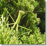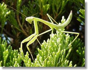 仕事の帰り、信号待ちしていてふと横を見たら 植え込みの中からこちらを見ているカマキリと目が合った。 まだ子供のようで小さい、3センチか4センチぐらいか、 自転車を止めてデジカメを出す。 ジッとしていてよと願いながらシャッターを切る。 バッチリだ。 大人のように大きく写ったぞ、しめしめ。