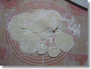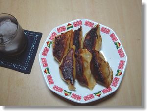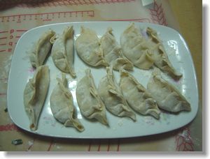 今度は餃子に挑戦だ。 餃子の皮を買ってきて作った事は何度もあるが 皮からの挑戦は始めてだ。 ネットでの検索では強力粉と薄力粉半々 の分量で作るらしいのだが 強力粉の袋に付いていた餃子の作り方では 強力粉だけのレシピだった。 簡単にと安易に強力粉だけで作る事にした。 キレイに丸くは伸びなかったけどよしとしようハハ レシピだと丸い物で切り抜くと形がそろうとあったが、 まあそう堅苦しいことは無しとしようじゃないの ゆがんだままの皮で具を包んだ。 結構様になるではないか、 水をいれ蒸し焼き、どうしても皮が硬いので 水を足して焼き直し・・トホホホ 今度は焼きすぎた。 中身は美味しいのに皮が私には硬いと感じてしまう。 気のせいかなあ 夫は美味しいとも不味いとも言わずに全部食べた。 全部食べたと言うことは不味くは無かったと言う事かな と勝手に思う事にして、 リベンジ!! 今度作る時は強力粉と薄力粉を半々にして作るぞ。