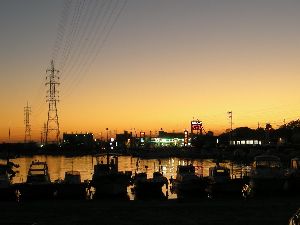 西の空を見ると夕焼けが何とも幻想的、ヨットや漁船がシルエットになって