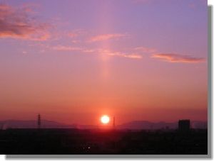 『太陽柱だと思うのですが。 サンピラー (Sun pillar) とも呼ばれ、「太陽の上にまっすぐ伸びた光。 寒い日日の出、日の入りの前後に見える。氷の結晶に太陽の光が反射してできる現象」 だそうです。』 |