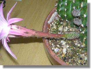 サボテンの花が一輪だけ咲いた。エキノプシス属「桃色短毛丸」